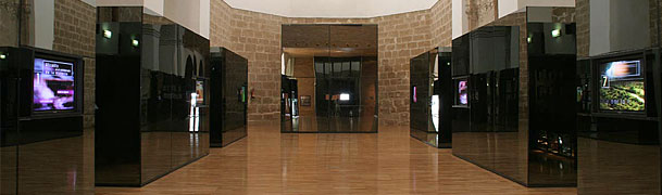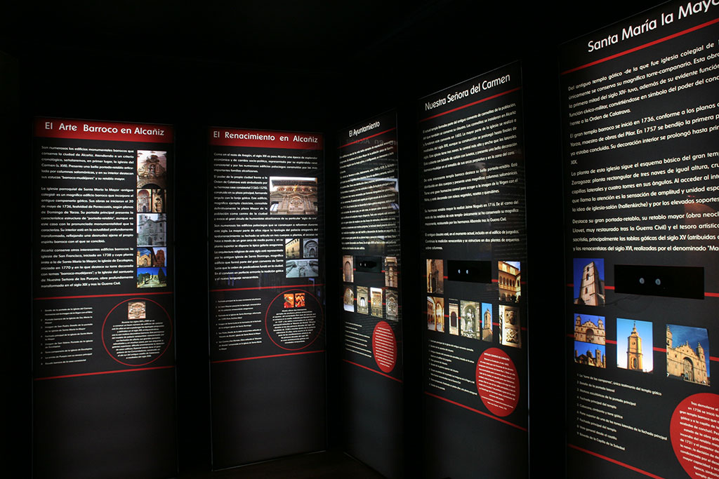 El diseño del espacio principal nos permite exponer la historia de Alcañiz mediante novedosos sistemas audiovisuales instalados en el interior de los cubos de cristal. Teatro virtual con personajes a tamaño natural, 9 monitores de plasma, videoproyecciones individuales, a 3 pantallas y con efectos murales, sonorizaciones independientes y de ambientación general, videowall de 12 monitores y sistema de control centralizado desde recepción que de forma automática conecta los equipos audiovisuales sólo cuando hay visitantes consiguiendo un gran ahorro energético y económico alargando la vida de las lámparas de videoproyectores y de los equipos en general; todo ello ejecutado de forma independiente en cada cubo y detectado por sensores y tarjetas electrónicas desarrolladas por Fotoprisma.