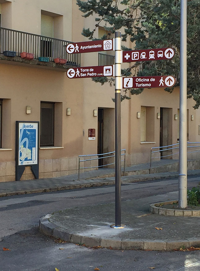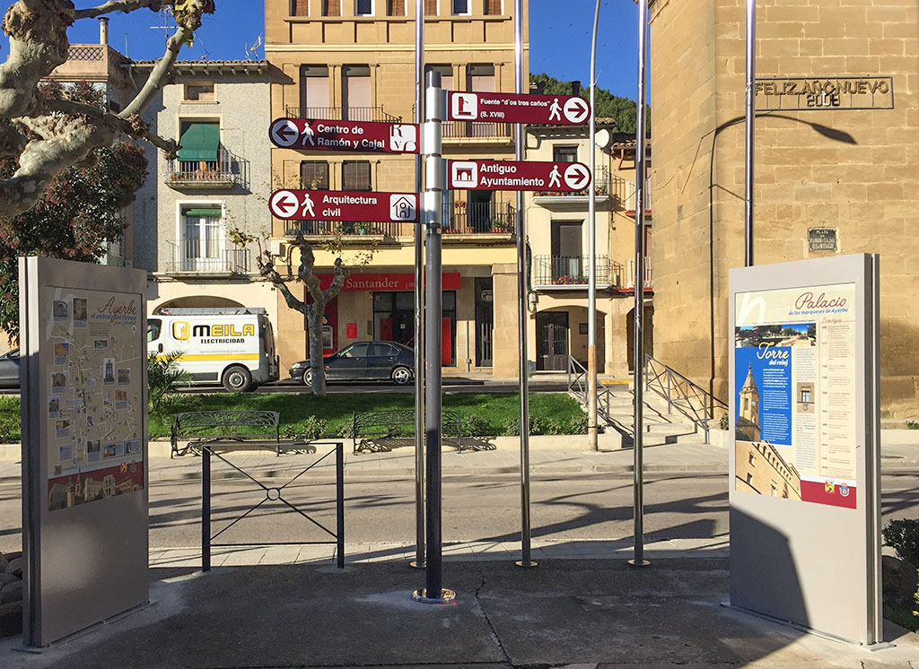 La localidad de Ayerbe en su continua lucha por potenciar los atractivos turísticos y servicios de su localidad ha encargado a Fotoprisma la implantación de señalización peatonal en todo su municipio.