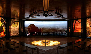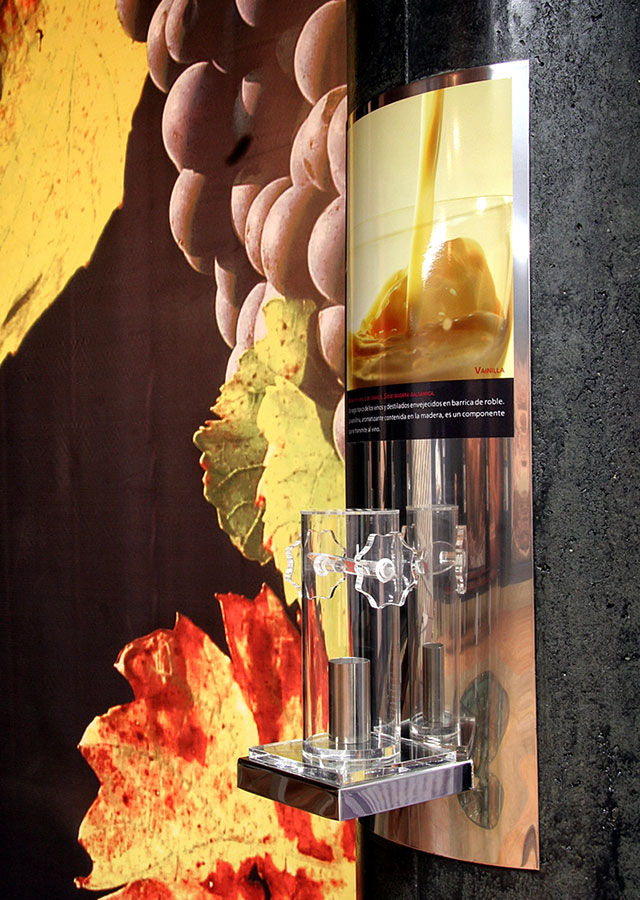 Efectos de iluminación, montaje audiovisual sobre pantalla curva, sonografía, expositores de aromas, paneles fotográficos e interpretativos.