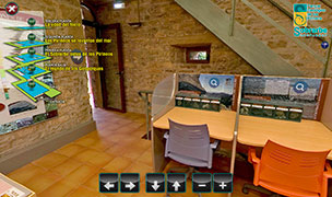 Cada una de las cuatro plantas del centro desarrolla una temática con la ayuda de diferentes medios audiovisuales: paneles interpretativos, vídeos, mapas, puntos interactivos, mesas de experimentación. también podemos realizar la visita virtual al centro desde los puntos interactivos con fotografías 3D navegables y acceso a toda la información.