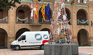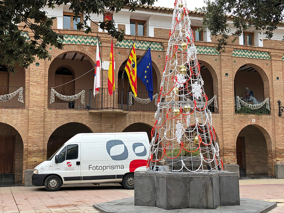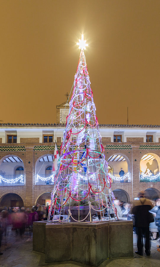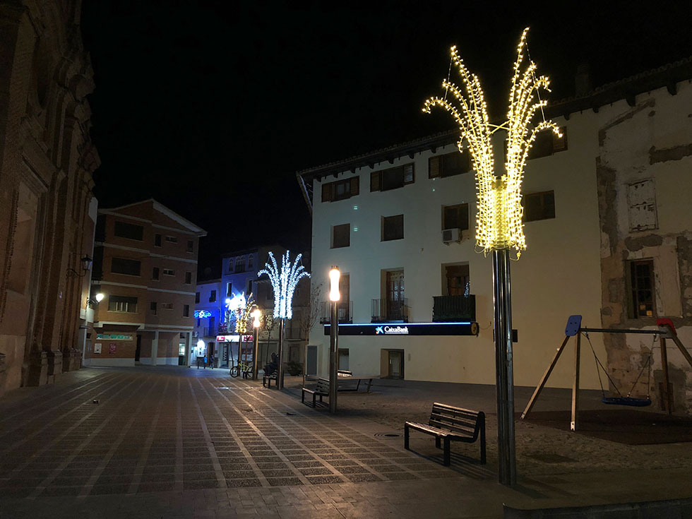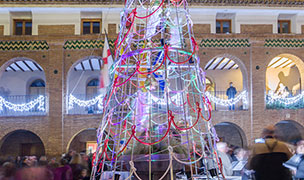 El acto de encendido tiene lugar en la plaza de España, donde se han instalado nuevos elementos como un gran árbol de luces que preside la fuente, donde no faltan los villancicos de la Coral Almuniense y la presencia en directo de las cámaras de Aragón TV.