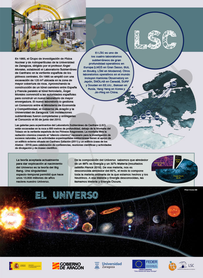 Las galerías para experimentos del Laboratorio Subterráneo de Canfranc (LSC) están excavadas en la roca a 800 metros de profundidad, debajo de la montaña del Tobazo en la vertiente española de los Pirineos Aragoneses. La montaña filtra la radiación cósmica creando el “silencio cósmico” necesario para la investigación de sucesos naturales particulares como son la colisión con un átomo de neutrinos provenientes del cosmos o con partículas de la invisible “materia oscura”.