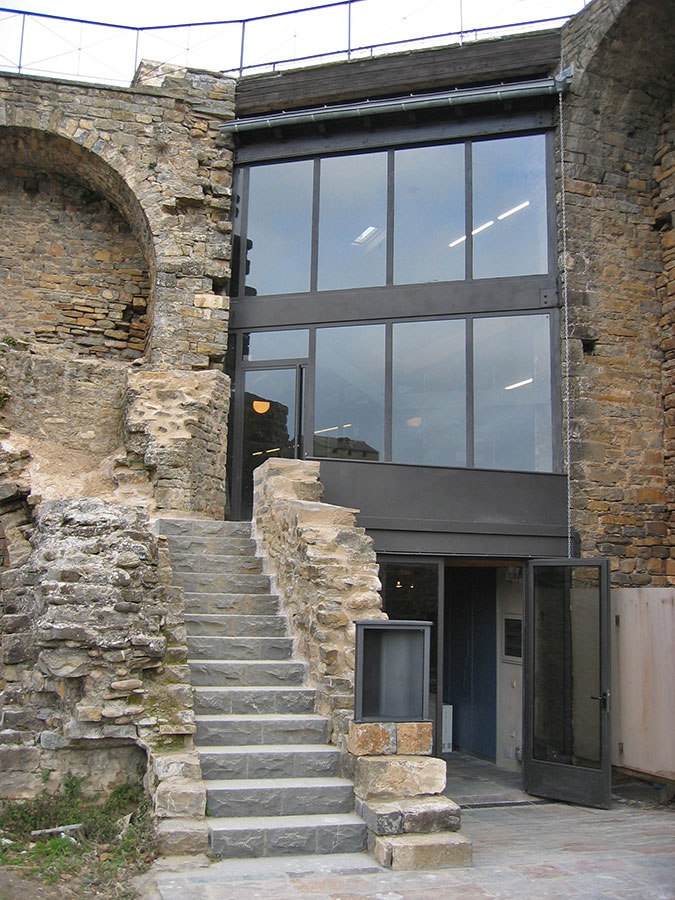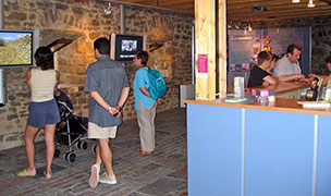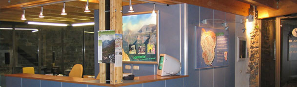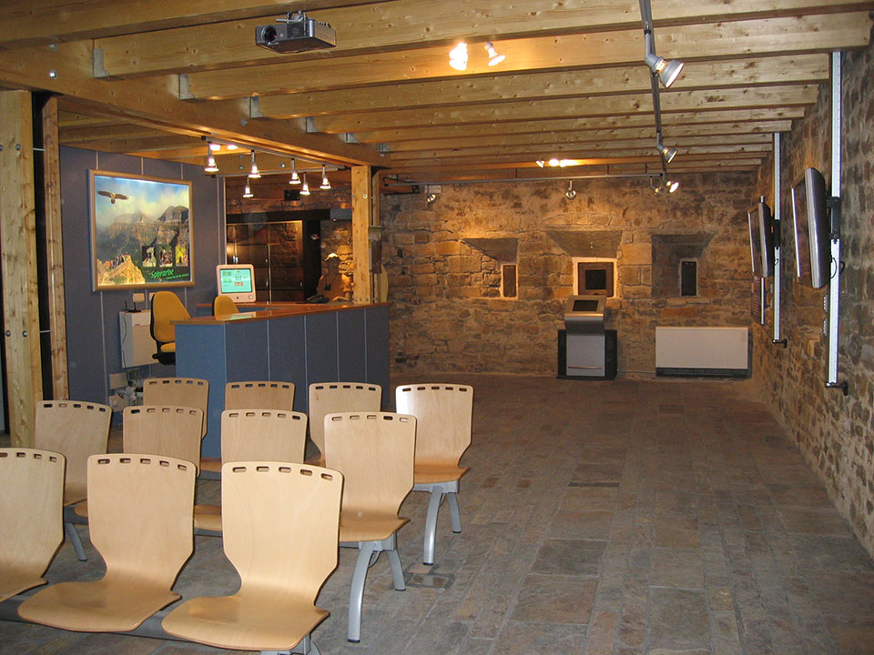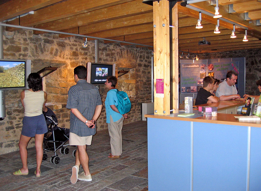 Situada en el interior de una de las torres del Castillo de Aínsa, esta Oficina de Turismo de la Comarca de Sobrarbe rompe con la idea tradicional de este tipo de espacios añadiendo, además de un diseño moderno y diferenciado, elementos interactivos con los que el visitante recibe información a la carta mediante sistemas audiovisuales.