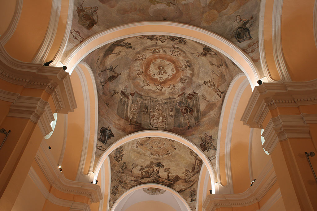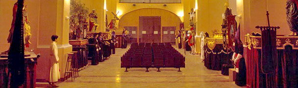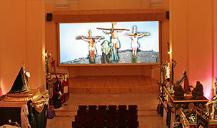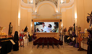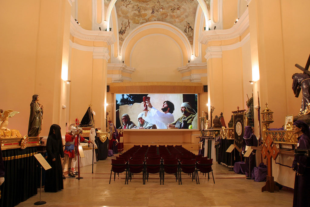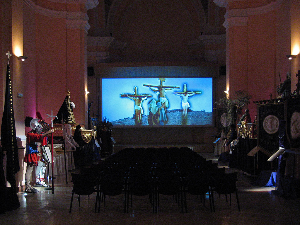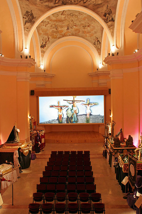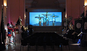 Completo diseño y ejecución realizado por Fotoprisma en la Iglesia de San Sebastián en Alcorisa (Teruel). El punto central de este trabajo es una producción audiovisual con la tecnología digital Watchout en formato panorámico sobre una pantalla de 9 x 3,5 metros. Asociado a la producción se realiza una representación escénica de los pasos y las pinturas de las cúpulas mediante control de luces con efectos de tambores y bombos de las cofradías de Alcorisa en sonido envolvente multicanal.